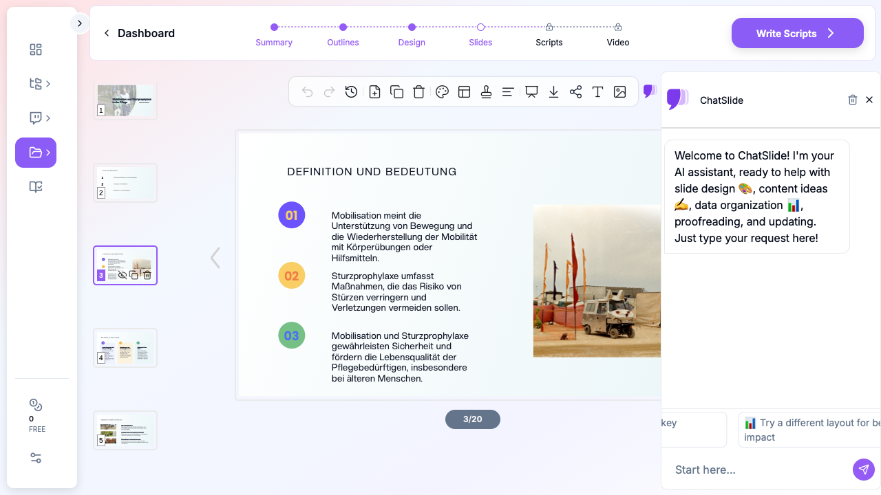 Pflegepräsentationen müssen nicht stundenlang dauern. ChatSlide hilft Pflegefachkräften und Pflegestudierenden, professionelle Folien zu Fachthemen wie Sturzprophylaxe, Mobilisation und Pflegeplanung in Minuten zu erstellen.