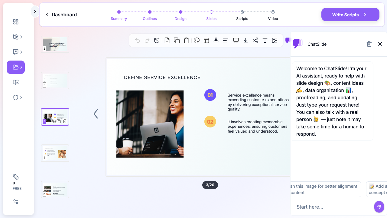 Service training benefits enormously from visuals — customer journey maps, process diagrams, metric dashboards. ChatSlide adds relevant images and suggests chart layouts that make abstract service concepts tangible.