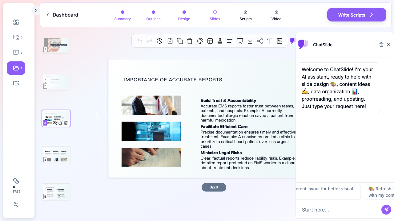 Ready to build your next EMS training module? Visit ChatSlide to create professional training presentations in minutes. Enter your topic — whether it's PCR documentation, patient assessment protocols, or quality improvement training — and let AI handle the slide design while you focus on developing your crew's skills.