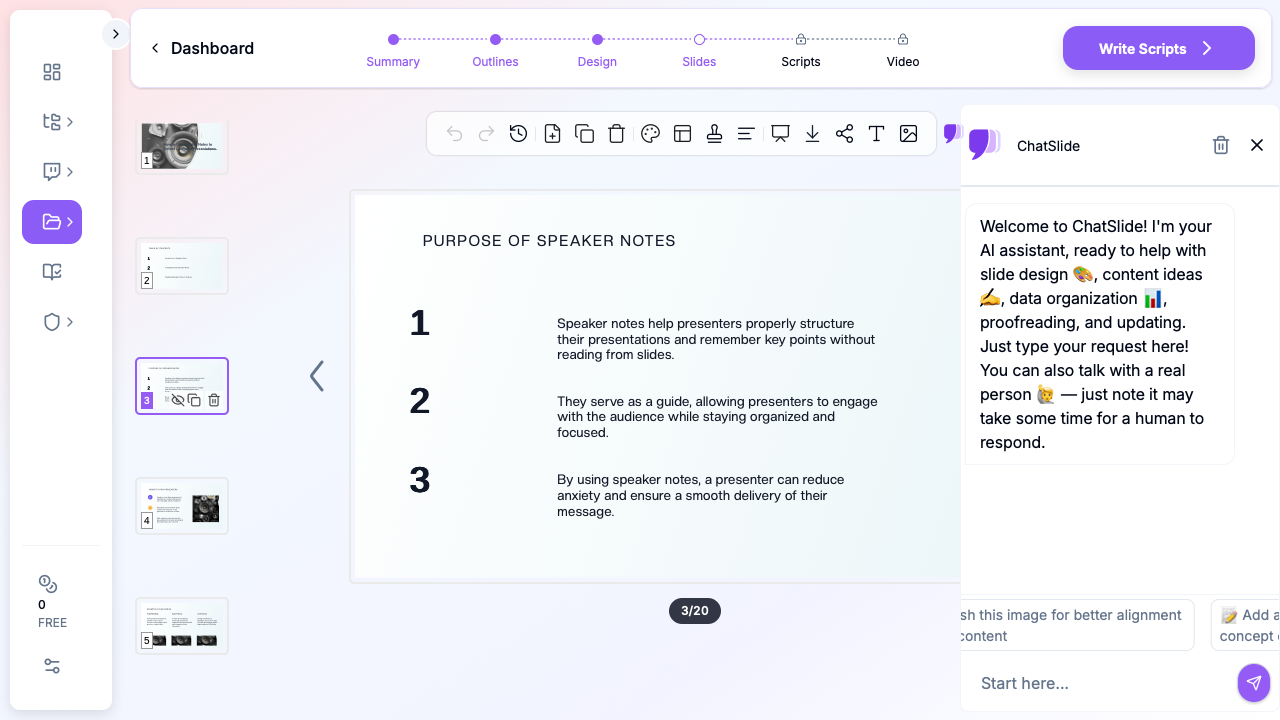 ChatSlide AI creates complete slide decks from a topic, document, or outline, then generates talking point scripts for each slide. The scripts function as a starting point for your speaker notes — you review and adjust them to match your voice, then export or copy them into Google Slides.