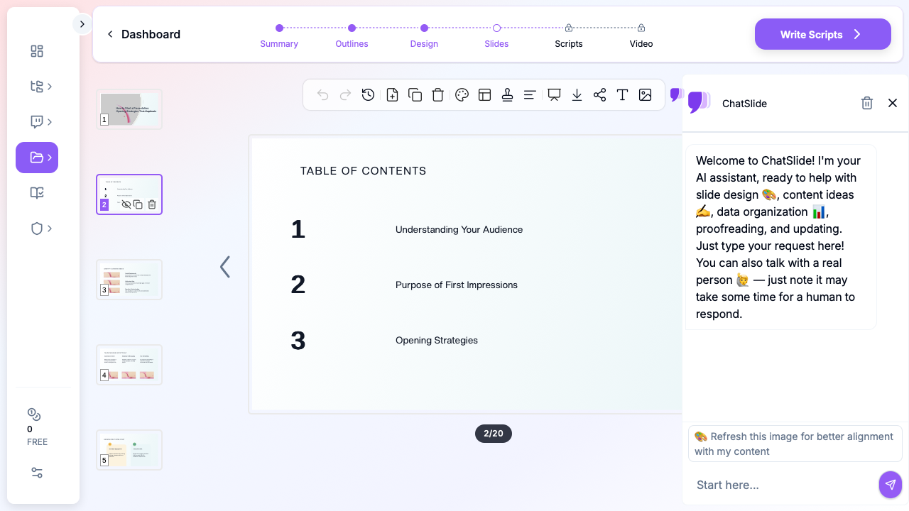 ChatSlide AI generates presentation slides from a topic or document, including a strong title slide and opening section designed to match the tone of your content. You can use the AI-generated structure as a starting point and adjust the opening slide to match whichever strategy you choose above.