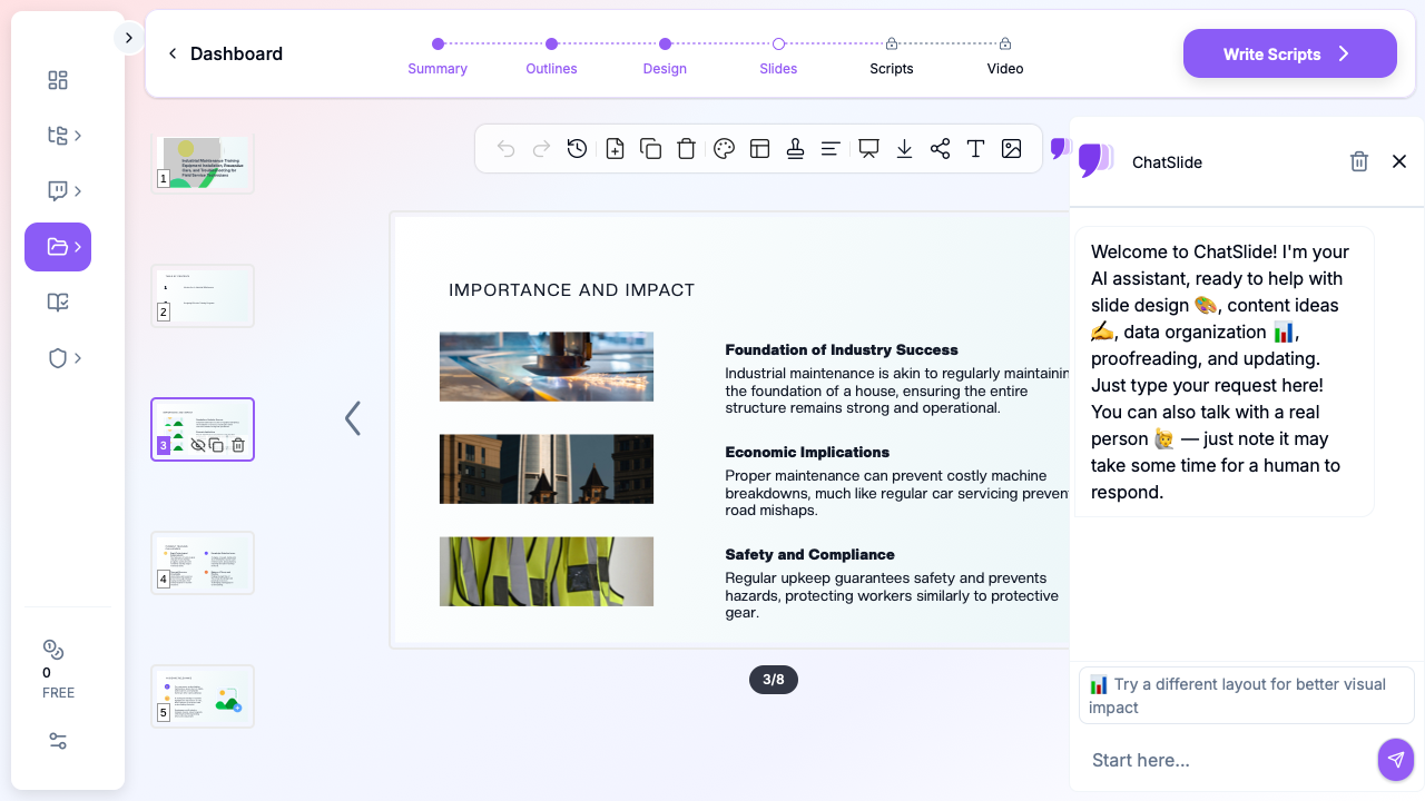 Start a free ChatSlide project and pick the Training scenario. Upload whatever reference material you have. Edit the outline to match the procedural order your technicians will follow. Generate, review, and hand the draft to a junior technician for a sanity check before you run training.