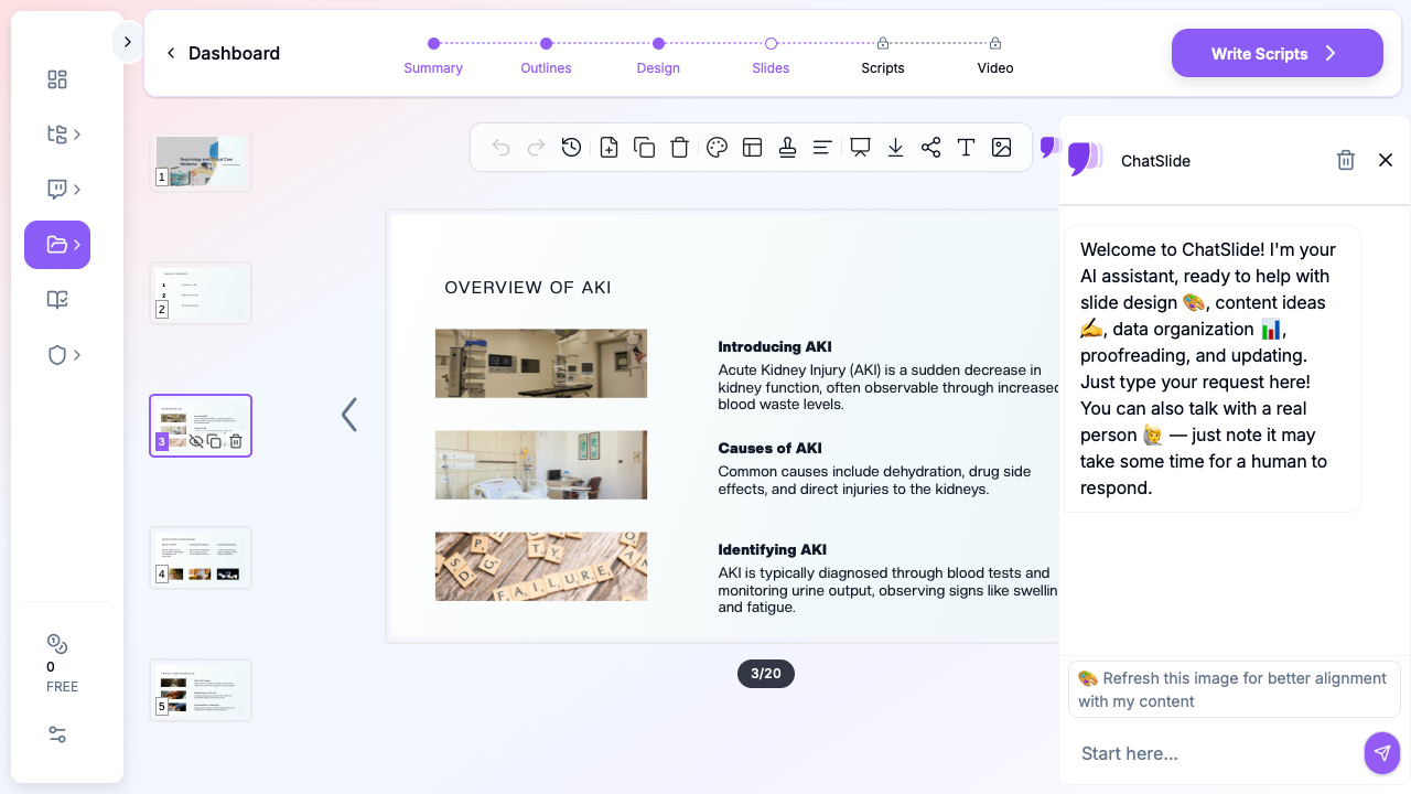 ChatSlide helps nephrologists, intensivists, and renal researchers create structured, professional presentations faster — whether you're presenting AKI risk score validation at an international conference, leading a dialysis journal club, or preparing an ICU quality improvement report.