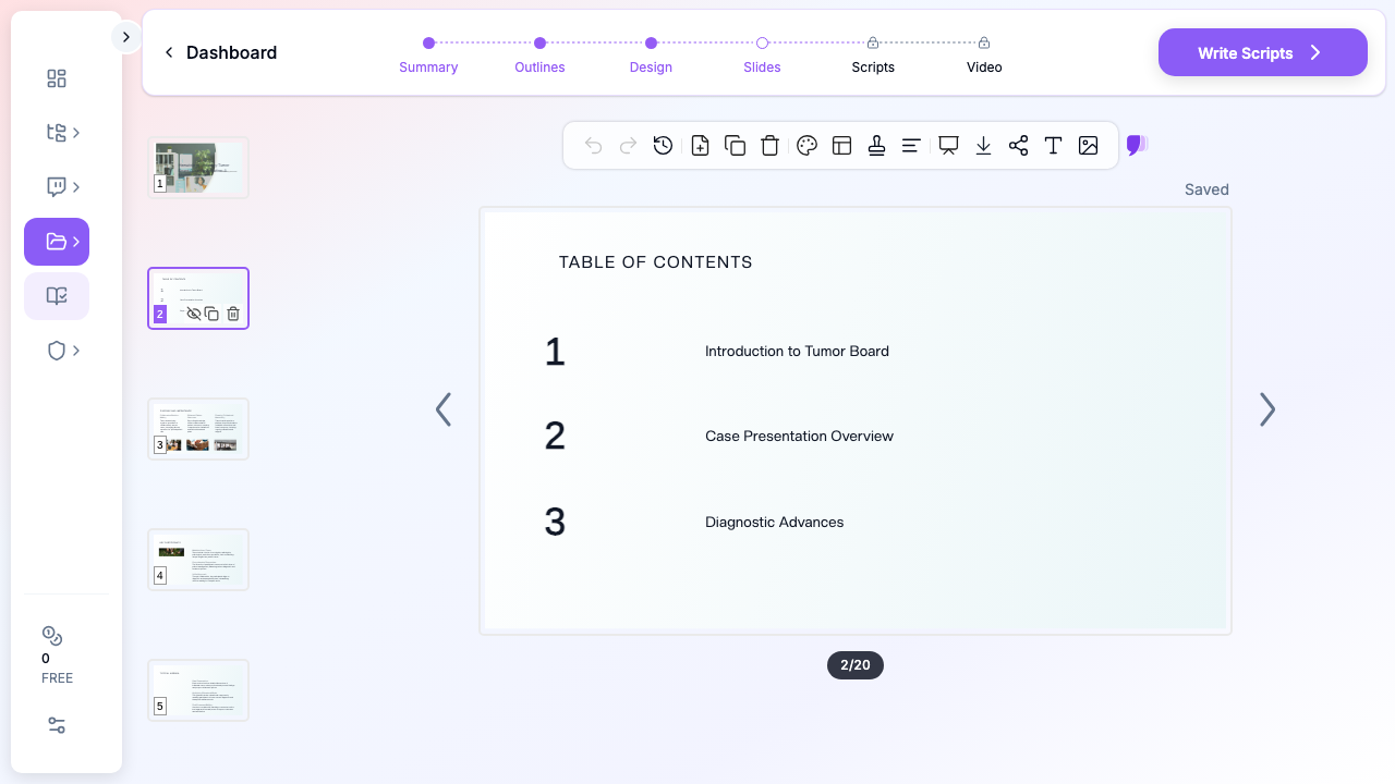 For fellowship didactics or board-prep lectures, the Scripts tab generates a per-slide speaker note. This is especially useful for trainees presenting their first didactic — the script gives a coherent narration to read off and adapt, instead of staring at a sparse outline at 7 a.m.